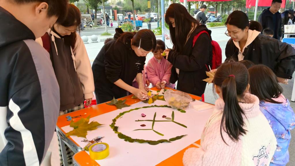 活动现场,各色落叶成为创作的主要素材。同学们精心挑选形状各异的叶片,在画布上巧妙构图,将平凡的落叶变为生动的图画,银杏叶拼成振翅的蝴蝶,枫叶叠出绚烂花朵,同学齐心协力用叶片拼出“五十”字样与校徽图案,以秋叶为媒,表达对母校的深切祝福。在专注创作中,同学们暂离学业压力,全心感受艺术与自然的交融。活动巧妙将心理疏导融入艺术,大家在挑选、构思与拼贴中放松心情、表达自我。