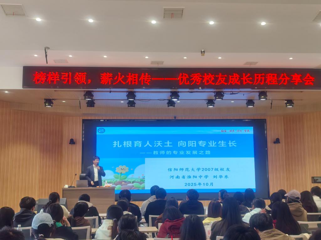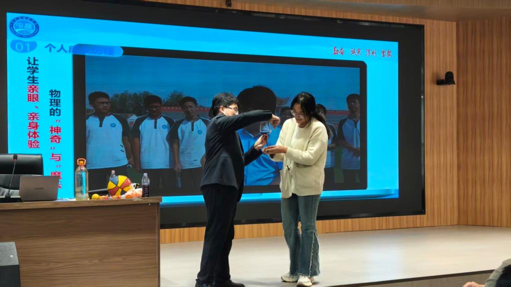 报告中,刘华东以“个人成长轨迹”为脉络,从个人成长、成长密码、发展路径、成长感悟与展望四个维度分享。他深情回顾从信阳师范大学本科毕业,到深耕教学一线获评物理高级教师,再到斩获“河南省最美教师““全国最美教师”等荣誉的进阶历程,用“十年磨一剑”的坚守,诠释了教育者对“立德树人”初心的执着追求。报告会现场,他结合专业特色开展生动有趣的实验展示,师生互动让抽象的物理原理转化为直观可感的实践体验,既激活了学子的专业兴趣,更传递了“理论与实践融合”的教学理念。